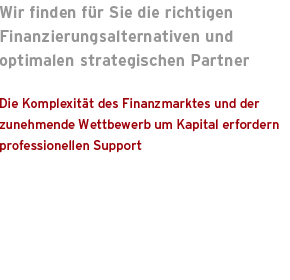 Wir finden für Sie die richtigen Finanzierungsalternativen undd optimalen strategischen PartnerDie Komplexität des Finanzmarktes und der zunehmende Wettbewerb um Kapital erfordern professionellen Support |