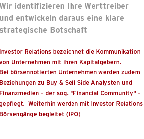 eine Aktie, korrekt beurteilt werden kann. Eine weitere Zielsetzung ist es, die Erwartungen des Marktes zu steuern. Unsicherheiten und unklare Kommunikation können genauso zu einer Unterbewertung der Aktie führen wie schlechte Gewinnzahlen. Auf der anderen Seite führen zu optimistische Aussagen zu einem Vertrauensverlust. Unabhängig vom wechselnden Börsenklima werden notierte Unternehmen täglich mit Zulassungsfolgepflichten wie der Einhaltung von gesetzlichen Grundlagen und vielfältigen Fragen zu Verhaltensregeln konfrontiert. Durch unser Know-how erfassen wir auch komplexe Inhalte schnell im Detail und bringen sie – zielgruppengerecht – in klare Botschaften. Die zielgerichtete Formulierung der Equity Story ist es, die Ihre Anleger überzeugt. |