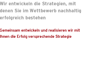 Wir entwickeln die Strategien, mit denen Sie im Wettbewerb nachhaltig erfolgreich bestehenGemeinsam entwickeln und realisieren wir mit Ihnen die Erfolg versprechende Strategie |